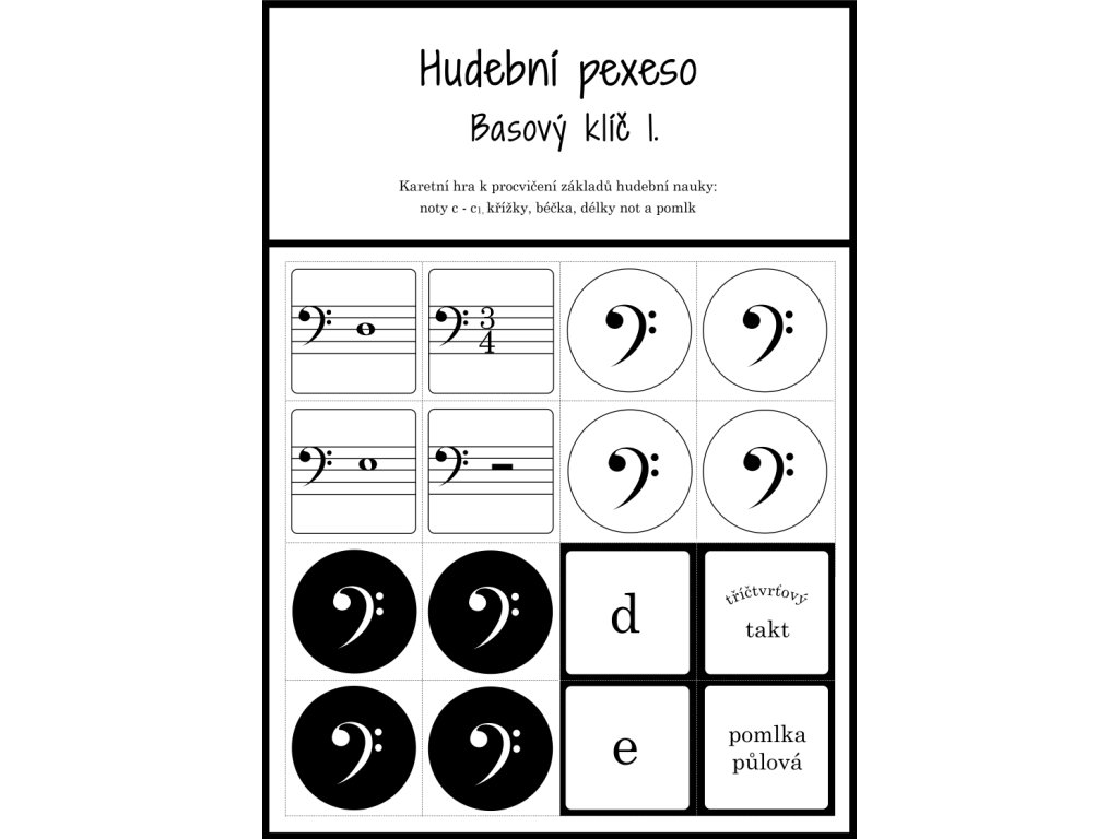 Hudební pexeso - Basový klíč 1 - 72 kartiček pro zábavnou výuku hudební nauky